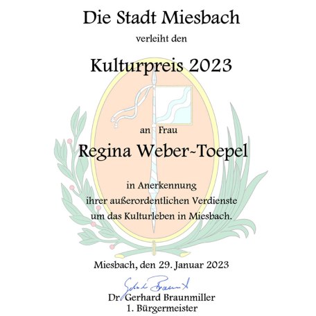 Im festlichen Rahmen des Neujahrsempfangs der Stadt überreichte er mit einem großen Strauß Blumen die begehrte Urkunde, die Regina Weber-Toepel nun in eine Reihe mit Max Winkler (2003), Rudolf Maier-Kleeblatt (2006), Walter Kohlhauf (2010) oder Sängerin Elisabeth Neuhäusler (2016) stellt.